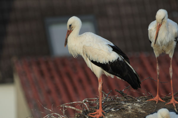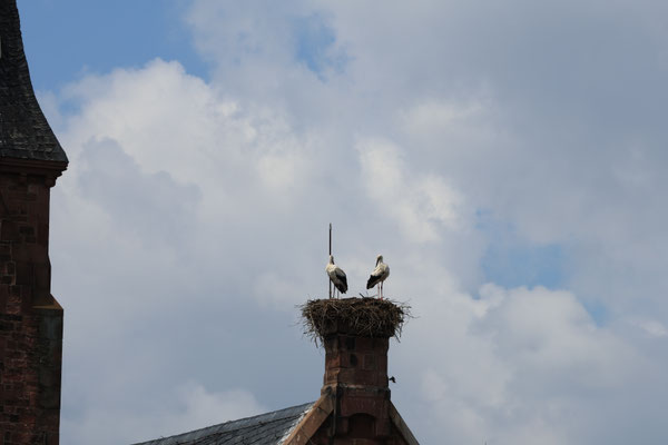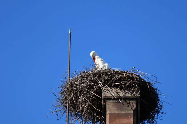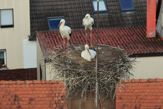 So hat sich das Brutpaar in unmittelbarer Nähe auf der evangelischen Kirche in Rückingen niedergelassen. Dies führt leider zu ungeahnten Problemen für die Störche und die Kirchengemeinde.